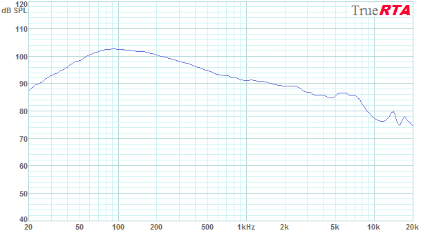 As a low frequency stress test I tried to drive the array to 10% distortion at 50 Hz. This is one measure of the maximum operating level of a speaker in the low bass range. Figure 5-13 shows the array operating at the highest level I could generate before the everything in the room started vibrating loudly. The system reached 113 dB SPL at 50 Hz with 65 Watts of drive level (18.7 Vrms into 5.33 Ohms). The dominant distortion is 2nd harmonic at -26 dB or 5% distortion. The 3rd harmonic is at -29 dB or 3.5%. The 5th harmonic was only at -48 dB or 0.4%. This is excellent high SPL low bass performance! A single array can drive the ROOM to the limit of what it can take with just 65 Watts at 50 Hz. At the highest levels a person (or room) can stand (113 dB SPL in this case) the distortion does not exceed 5% at 50 Hz.