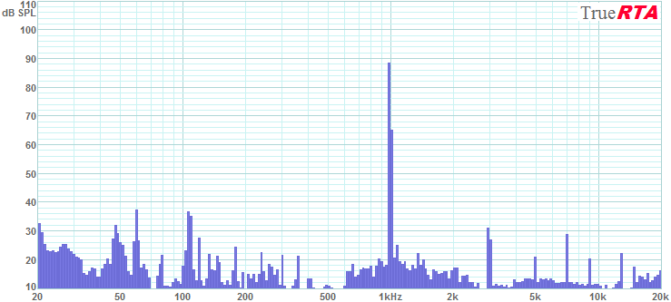 Figure 5-11 shows the array at 1 kHz with 1 Watt of input creating 89 dB SPL. The 2nd harmonic is absent with the 3rd harmonic (3 kHz) at -57 dB (0.14% distortion) compared to the fundamental at 1 kHz. The 5th harmonic is at -67 dB or 0.04%. The 7th harmonic pops up to 0.1% but the 9th and higher continue the fall to lower levels.