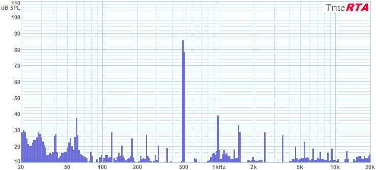 Note the results above are for just 1 Watt into the array or just 1/24th of a Watt per driver. If the array were driven at 24 Watts each driver would then get 1 Watt and the output of the array would increase by 14 dB. This means that at 200 Hz a single array would generate 98 + 14 = 112 dB SPL with each driver at 1 Watt(24 Watts total input). Yet the distortion would be similar to a single driver driven at 1 Watt, that is, very low. How many other speakers do you know that can generate 112 dB at 200 Hz with distortion on the order of 0.2%? The array's performance at 500 Hz is shown in Figure 5-10. Output has fallen to 86 dB SPL for 1 Watt at 1 meter but the distortion continues to be quite low. The 2nd harmonic is at -47 dB or 0.4% distortion. The 3rd harmonic is at -53 dB or 0.2%. The 5th harmonic is at -58 dB or 0.13%. Higher harmonics descend further in level.